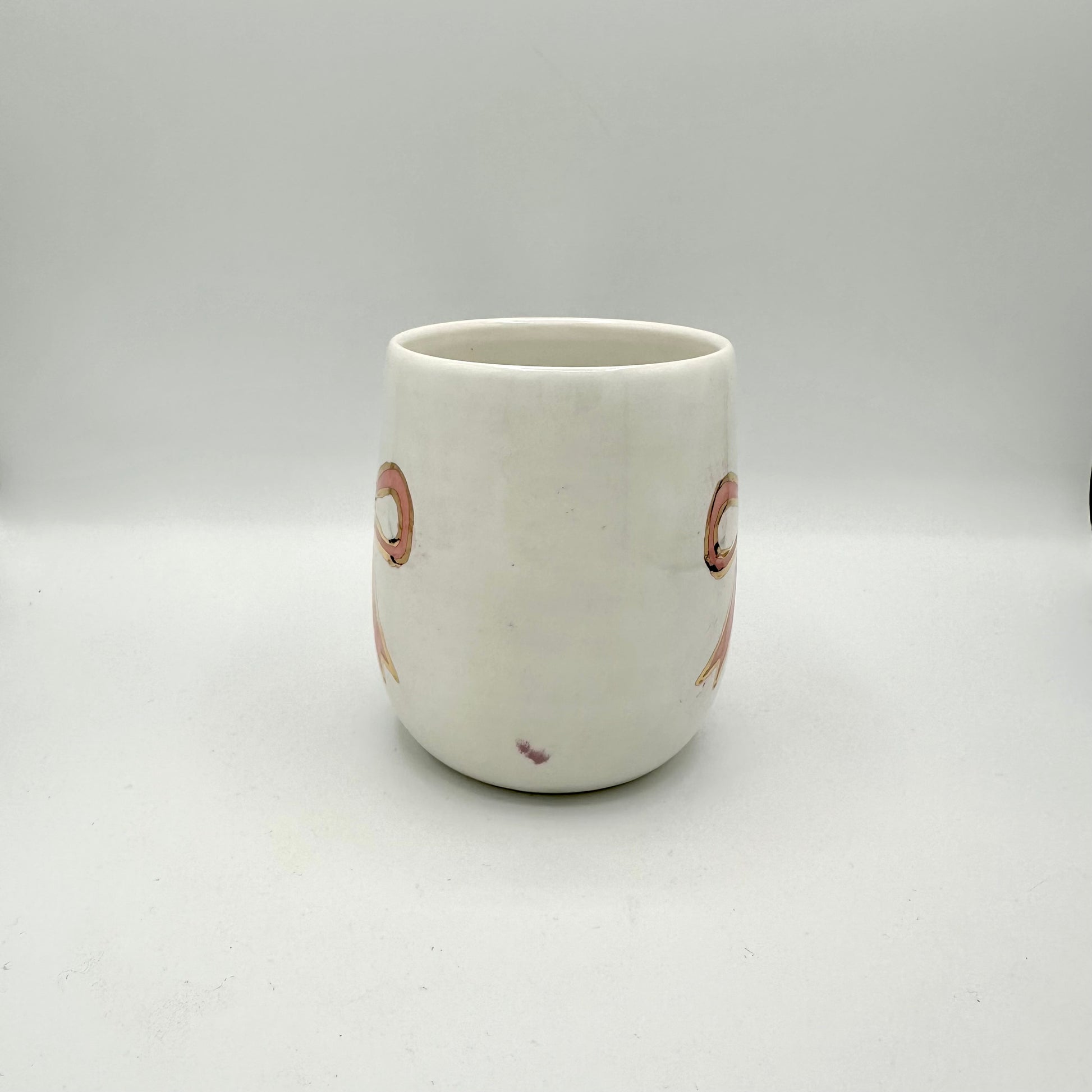 Perfectly imperfect! This porcelain pink bow mug with 22K gold trim is listed as a second with a 10% discount. The discount will show up at checkout.