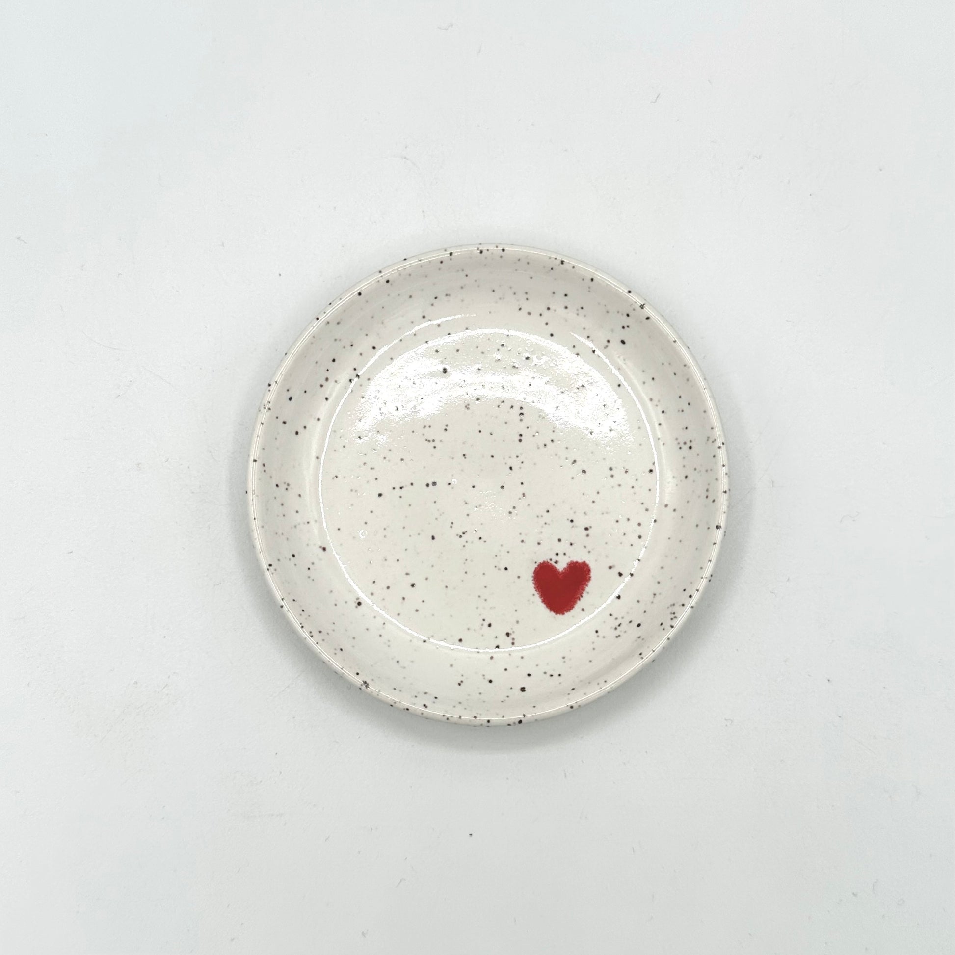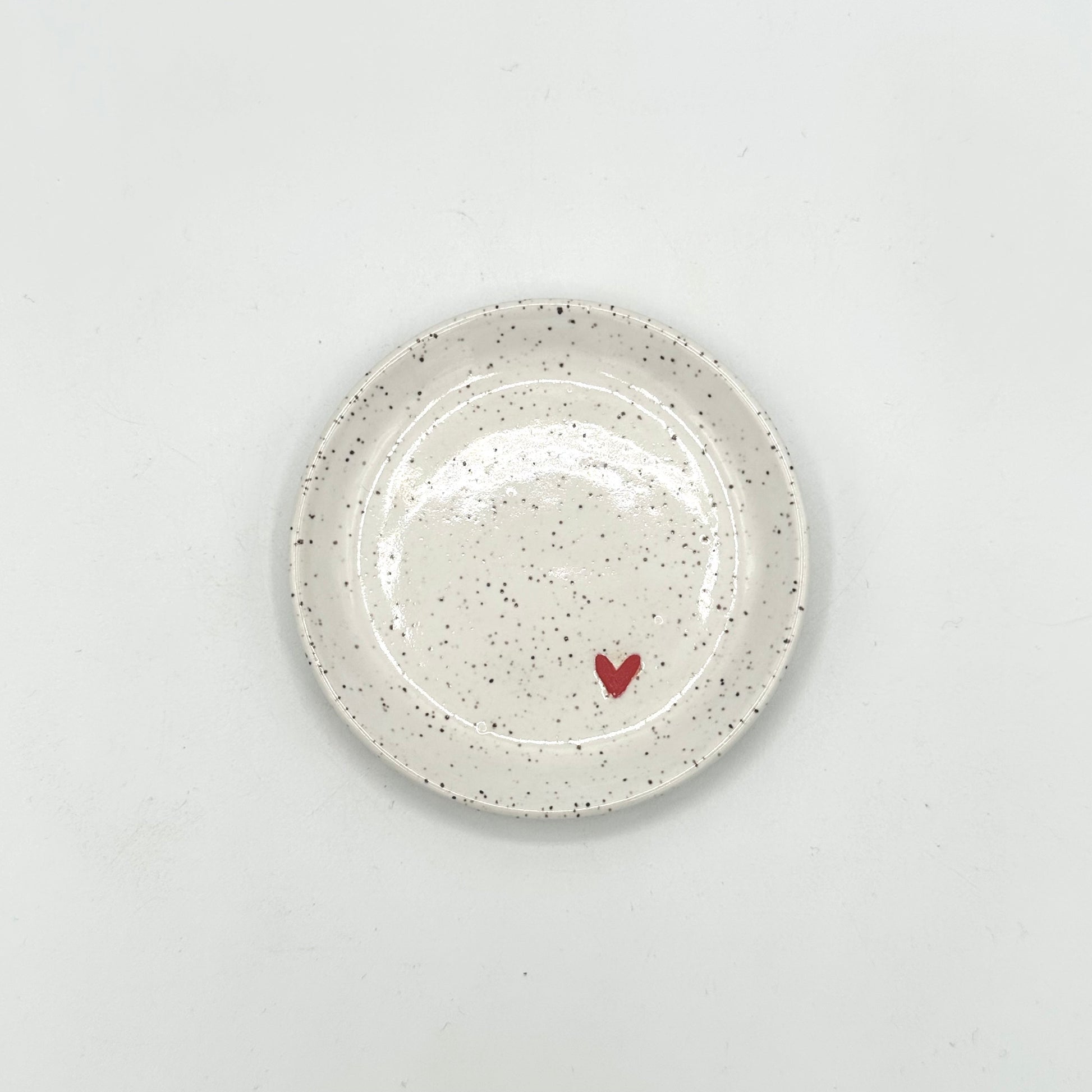 This small jewelry/trinket dish is a convenient and stylish way to store your rings, earrings, bracelets, necklaces or other small objects. With its compact size, it can easily fit on your bedside table, dresser, desk or by the sink on the bathroom or kitchen counter. A great way to keep your jewelry organized and visible and to never lose track of your favourite pieces again. Glazed in a glossy white finish and adorned with a cute little red heart.